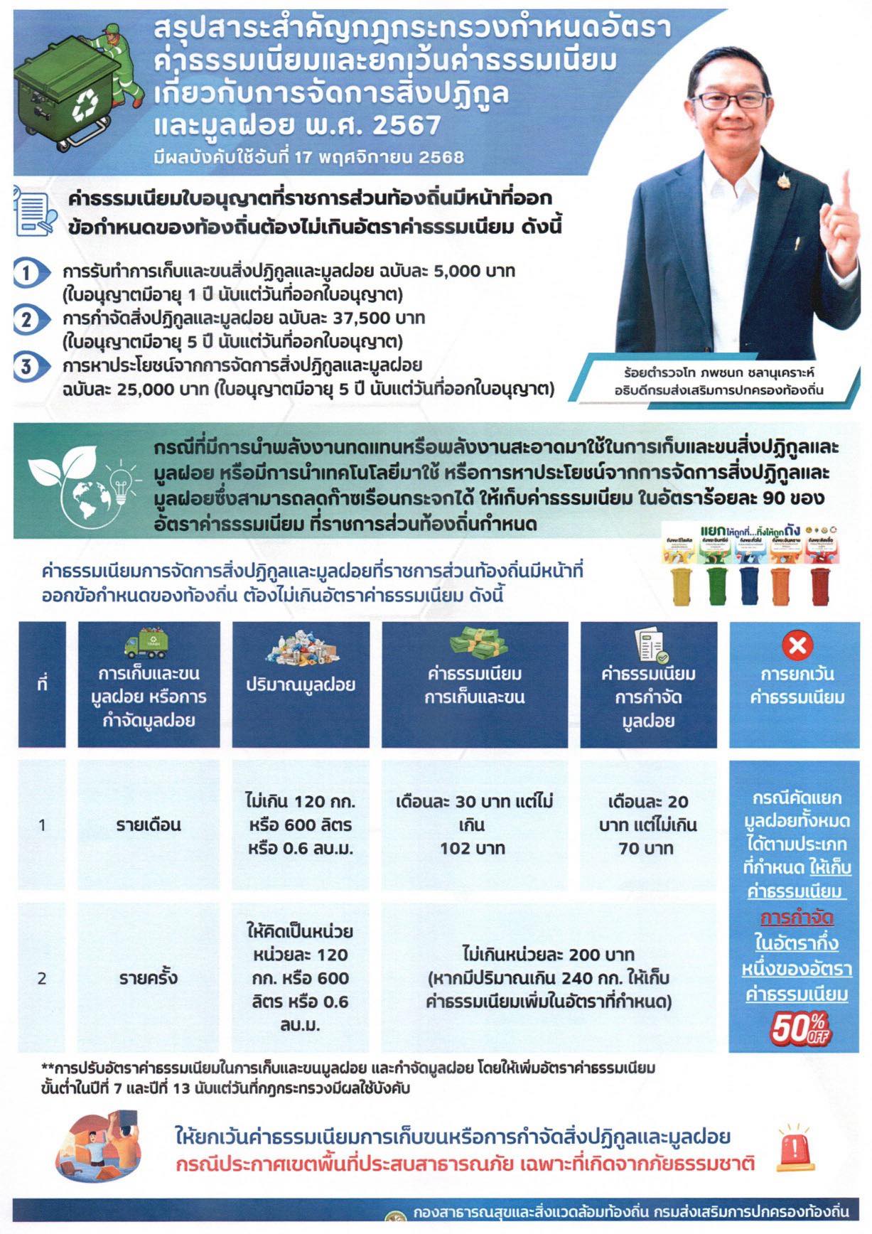 การบังคับใช้กฎกระทรวงกำหนดอัตราค่าธรรมเนียมและยกเว้นค่าธรรมเนียมเกี่ยวกับการจัดการสิ่งปฏิกูลและมูลฝอย พ.ศ. 2567 เป็นระยะเวลา 1 ปี (ตั้งแต่วันที่ 17 พฤศจิกายน 2568 - วันที่ 16 พฤศจิกายน 2569)